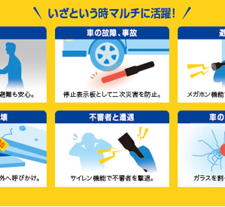 「防災マルチライト」(株式会社サンエイ)は1つで6役の優れもの。ライト機能はもちろん、誘導灯機能、メガホン機能、サイレン機能、録音・再生機能も備え、緊急時にはガラスハンマーにもなります。